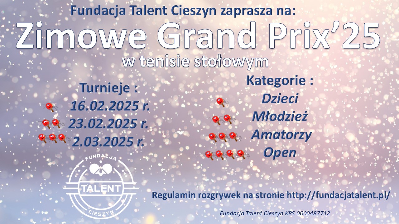 Zimowe GP’25 turniej #1 Zimowe GP’25 turniej #1 Za nami pierwszy turniej Zimowego Grand Prix’25 w tenisie stołowym W niedzielnej rywalizacji uczestniczyło 45 zawodników Najlepsi...Dowiedz się więcej
