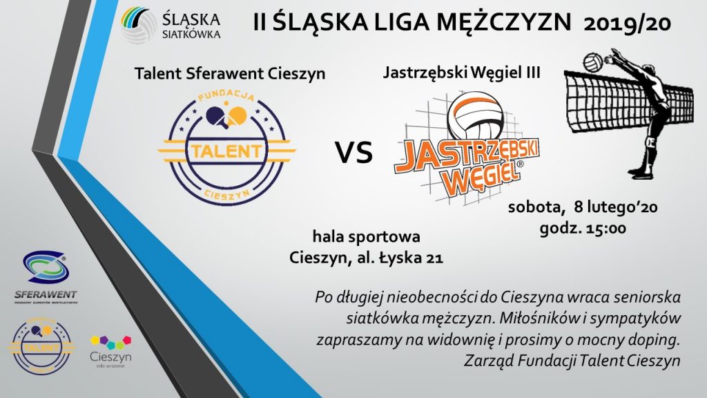 W sobotę 8 lutego w hali przy alei Łyska siatkarze Talent Sferawent Cieszyn pojedynkiem z III drużyną Jastrzębskiego Węgla zainaugurują rywalizację w II Śląskiej Lidze Mężczyzn. Ostatnio cieszyniacy mogli kibicować swoim zawodnikom 41 lat temu kiedy to – jak podaje strona klubu Piast Cieszyn – początkiem 1979 roku została rozwiązana sekcja męskiej siatkówki KS Cieszyn. Po początkach naszej rywalizacji w rozgrywkach wojewódzkich minisiatkówki i juniorów w sezonie 2018/19, w bieżącym do kadetów dołączą seniorzy, którzy od września 2019 roku trenują pod okiem grającego trenera Michała Zająca. Ambitny cel to awans do I Ligi Śląskiej, czego zawodnikom i sobie życzymy. Podczas meczów zespół wspierać będzie swoją fachową wiedzą trener Włodzimierz Madej i -na co liczymy – kibice, których zapraszamy na widownię. Talent Sferawent Cieszyn – Jastrzębski Węgiel III